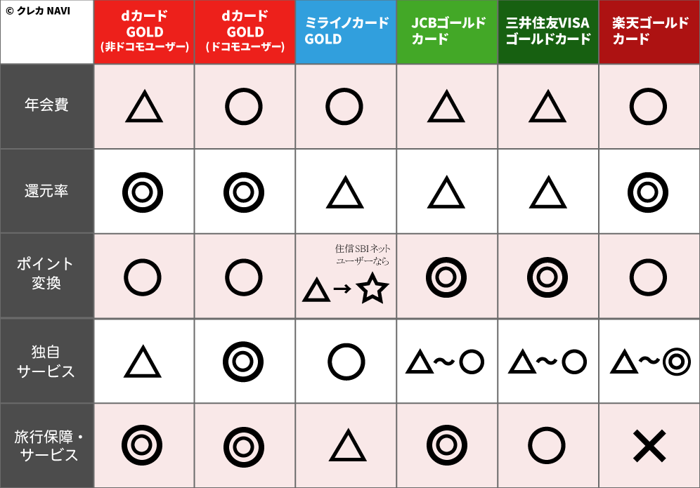 dカードGOLDを他ゴールドカード4種類と比較